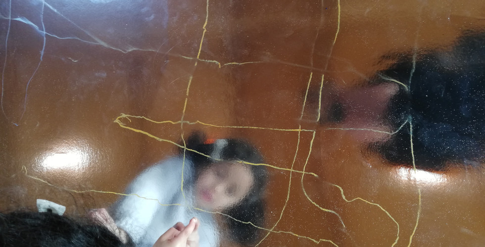 Dans un second temps, les petits performeurs ont chacun leur tour réalisé la silhouette d'un de leur camarade selon un scénario simple : le dessinateur, muni d'un pastel, pouvait inviter un camarade à prendre la pose et devenir modèle dans l'espace du papier réfléchissant, cette fois-ci dans une posture horizontale.